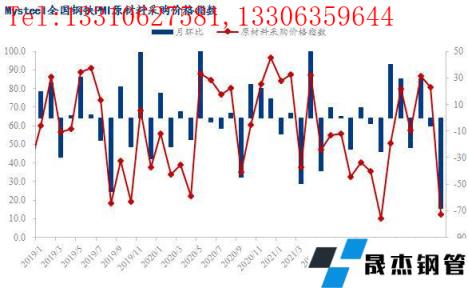 从相关指数来看,本月成品材出厂价指数大幅回落60.4个百分点至8.3,刷新年内低点,无缝厚壁钢管厂家成品材库存指数回落9.5个百分点至63.4,仍处荣枯线上方。同时成材价格下跌倒逼原料价格,本月原材料采购价指数大幅回落68.5个百分点至12.1,国内原材料采购量指数回落6.6个百分点至45.3,国外原材料采购量指数回落5.6个百分点至38.5。