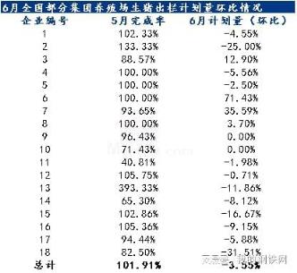 据农产品调研了解,针对18家集团养殖场全国生猪出栏情况来看,5月生猪出栏完成率总计101.91%,6月出栏量较5月实际出栏量环比下跌3.55%。