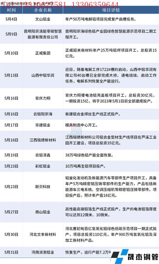 据不完全整理,2022年5月国内共14个铝项目开工、投产或复产。