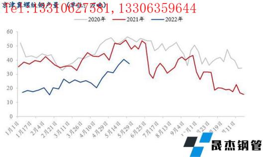 从上图可以看出,5月份京津冀建筑厚壁无缝钢管无缝厚壁钢管厂家的螺纹钢产量缓慢提升,虽然中下旬产量有所下降,但是仍处于相对高位,不过低于往年同期水平。截至5月底,螺纹钢周产量为37.51万吨,产量月环比提升17.6%,较去年同期低21.3%。本月除承钢受当地疫情影响,原料运输受阻,高炉有检修情况,导致建材产量有所下降外,其他无缝厚壁钢管厂家如敬业、东华、东海特钢、乐钢等月产量均有所提升,且随着运输情况缓解,无缝厚壁钢管厂家厂内资源陆续向周边市场分流。从调研情况来看,当前无缝厚壁钢管厂家螺纹钢生产成本在4500-4600元/吨,虽然利润微薄,但是6月份也无检修计划,且产量或较5月份有提升。