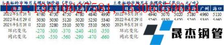 截至5月31日,东北地区建筑厚壁无缝钢管主要流向市场中螺纹钢价格海口4990元/吨最高、环比上月末跌350元/吨,北京4730元/吨最低、环比上月末跌300元/吨;盘螺海口5110元/吨最高、环比上月末跌350元/吨,沈阳4940元/吨最低、环比上月末跌320元/吨。