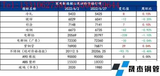 截止2022年6月2日,各原材料当日即时价格以及价格周环比情况如下: