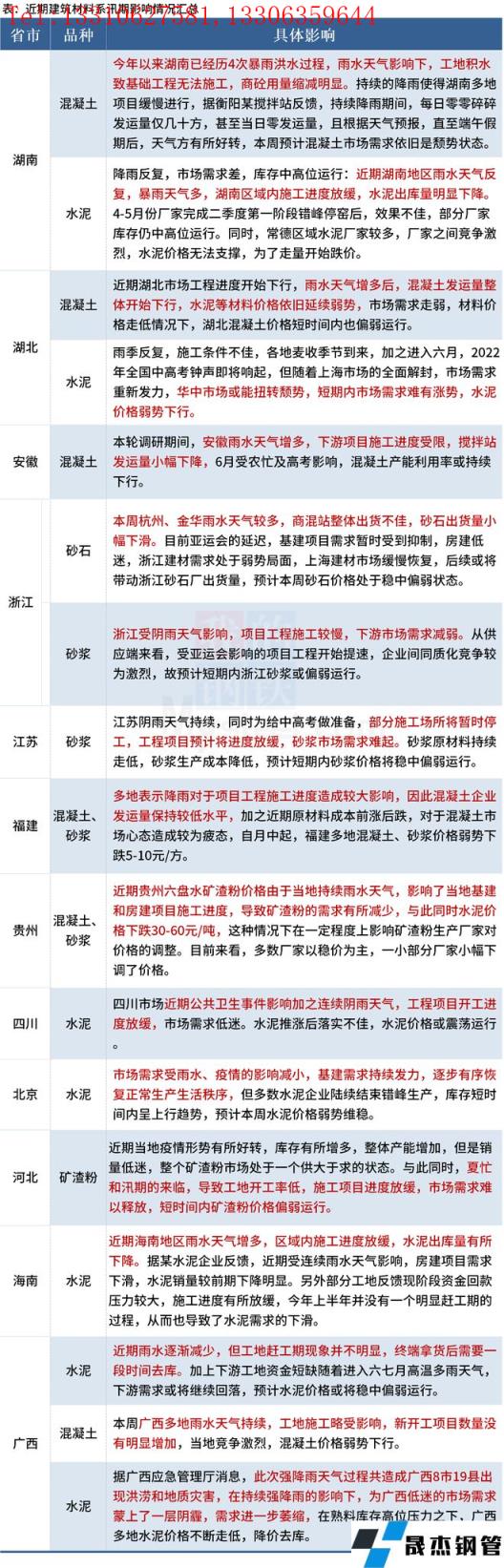 截至6月6日,据百年建筑网调研,华中、华东、西南、华南等12省市建材市场和建筑工地进度受到明显影响。短期来看随着部分省份农忙和大规模雨水天气预报来临,部分材料整体增量仍然有限,下游市场需求受到一定抑制,市场进入需求淡季,端午节前后价格随之出现下跌情况。具体情况如下: