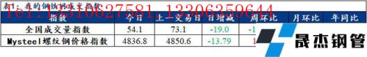 讯:全国建筑厚壁无缝钢管成交量监测,成交量相对指数来看,全国54.1减19,北方41减14.5,华东68.9减20.6,南方46.4减20。今日螺纹钢价格指数4836.8,较上一交易日减13.79。