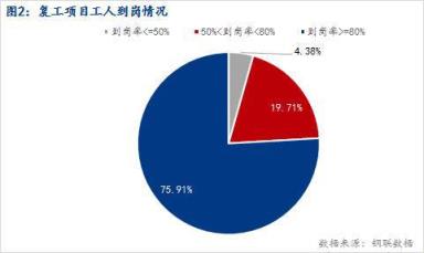 3、复工项目中,75.91%员工到岗率高于80%,82.35%施工进度恢复正常,其中18.07%有赶工需求;