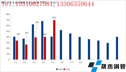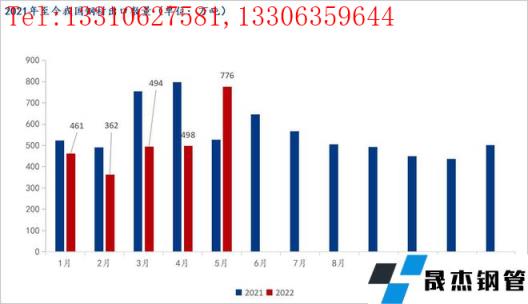 近期我国大部分区域已经开始逐步解除疫情封控,对于前期因疫情导致的运输受阻基本畅通,因此前期因运输导致的延迟发货在5月份已经有所体现,预计6月份仍有部分推迟订单陆续发出,因此6月份我国厚壁无缝钢管出口或将继续呈现增势,由于订单缩减,7月份起我国厚壁无缝钢管出口量或将开始逐渐低迷,回归正常至500万吨左右的出口量。