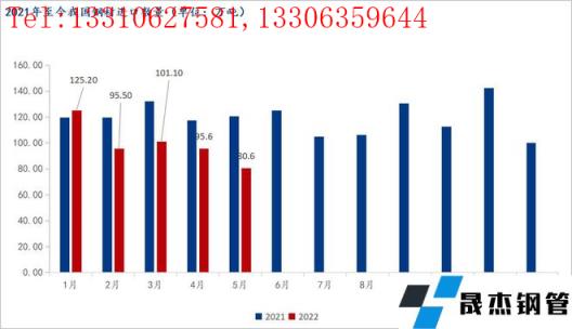 5月中国进口厚壁无缝钢管80.6万吨,较上月减少15万吨,同比下降33.4%;1-5月累计进口厚壁无缝钢管498.0万吨,同比下降18.3%。
