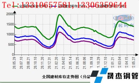 截止5月27日,全国无缝钢管 厚壁钢管社会库存连续3周下降:据云商平台监测数据显示,5月27日,全国无缝钢管 厚壁钢管社会库存指数为151.1点,比上月下降3.82%,比去年同期上升10.99%;其中建材社会库存指数为217.9点,比上月下降8.02%,比去年同期上升14.22%;螺纹钢社会库存量为721.37万吨,比上月下降7.75%,比去年同期上升13.87%。国内建材库存保持去库,但同比去年还是明显偏高。