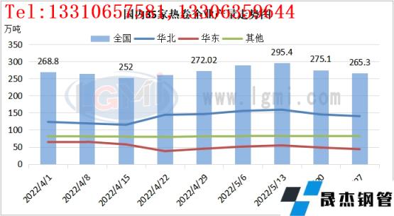 截止2022年5月27日,据云商平台监测数据显示,国内热轧卷板社会库存量约为243.71万吨,环比增加10.72万吨。重点城市库存整体表现不一,华东、华南库存小幅去库,华北区域天津社会库存有所累库。具体来看,广州地区热卷社会库存量约为61.91万吨,环比减少3.05万吨;上海热卷社会库存量环比减少0.21万吨至41.84万吨;天津热卷社会库存量约为7.20万吨,环比增加1.58万吨。