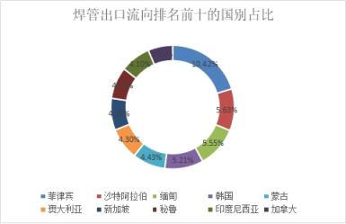 分地区来看,国内厚壁钢管出口市场主要集中在亚洲地区,5月份在焊管出口量中占比小幅下降至59.05%;亚洲以外国别中美洲出口量占比小幅下降至16.42%。从国别来看,我国焊管的主要流向地区依次为菲律宾、沙特阿拉伯、缅甸、韩国、蒙古、澳大利亚、新加坡、秘鲁、印度尼西亚、加拿大。较上月相比,菲律宾继续排名首位;沙特阿拉伯增长79.50%,蒙古增长56.45%,加拿大增长72.87,相继进入排名前十,智利下降67.09%跌出排名前十。从出口量排名前十的国别数量来看,亚洲占70%,美洲占20%,澳洲占10%。