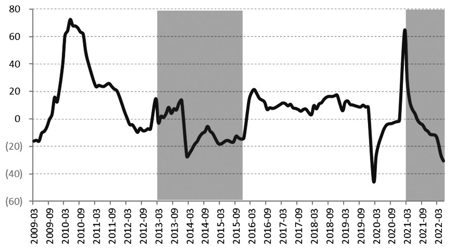 本轮地产调整周期始于2021年第二季度。在地产相关政策的驱动下,从2021年第四季度开始,地产新开工面积再次进入负增长状态,叠加疫情影响,降幅呈现加速下滑态势。受此影响,螺纹钢需求降幅可见一斑。根据上述分析,我们可以清晰看到,当前螺纹钢的需求表现和2013年有很大相似之处。