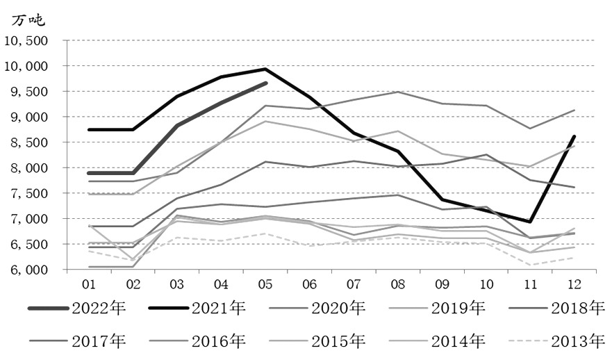 在过去近20年的时间中,我国粗钢产量呈现逐年上升趋势。2013年,我国粗钢月均产量为6454.8万吨。而今年1—5月,我国粗钢月均产量达到8712.7万吨。