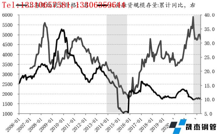 宏观环境对以螺纹钢为代表的黑色商品同样有着重要影响。本文选取社会融资这一指标,用以表征宏观环境的变化。笔者通过统计分析发现,过去15年,社融累计同比和螺纹钢现货价格之间的相关系数达到0.4,呈中度正相关特征。通常情况下,社融周期拐点领先于螺纹钢价格周期拐点。