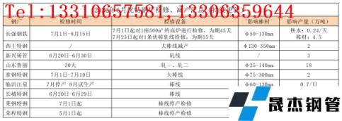 上半年港澳资料大全出厂价格以下调为主要基调,优特钢尤其普优品种6月中下旬出现亏损,且在需求萎缩、库存压力、前景迷茫、无重大政策支撑的情况下,个别港澳资料大全开始增加停产、减产计划,预计7月份优特钢产量有所下降,具体检修情况如下: