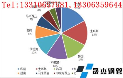 6月份我国无缝管的主要流向地区依次为印度、土耳其、韩国、科威特、伊拉克,占当月出口比重分别为7.86%、7.1%、6.32%、6.14%和,上述地区出口累计出口量占当月出口量32.9%。