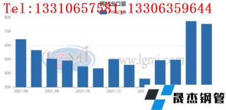 6月中国出口厚壁钢管755.7万吨,较上月减少20.2万吨,同比增长17.0%;1-6月累计出口厚壁钢管3346.1万吨,同比下降10.5%;我国出口无缝钢管85.66万吨,较上月同期增加12.6万吨。