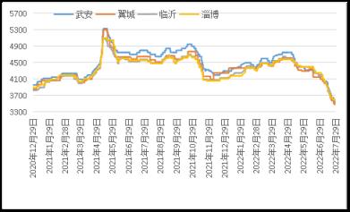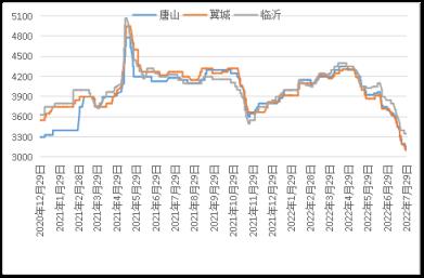 据云商平台监测数据显示,截至7月29日,炼钢生铁天津地区报价3120元(吨价,下同),较月初跌550元;唐山地区报价3150元,较月初跌550元;翼城地区报价3100元,较月初跌620元;临沂地区报价3350元,较月初跌500元(详见图2)。