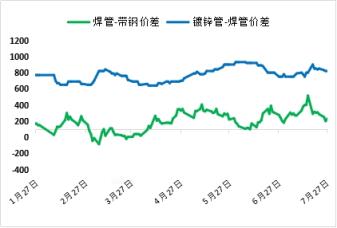 7月焊管较带钢价差,镀锌管较焊管价差走势趋于一致。月中阶段走扩后,价差空间再次收窄,月末焊管与原料价差收窄幅度大于镀锌管。目前管厂厂内原料轮换周期拉长至20天左右,部分规格拉长至1个月之久,月内出现停购原料3-5天的情况。结算周期内焊管生产利润平均盈利29元,架子管平均亏损7元;镀锌管较焊管价差收缩91元,管企综合生产利润改善不明显。