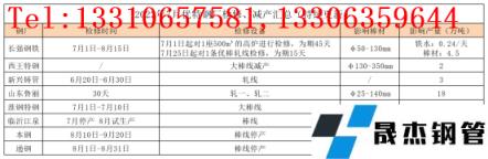 7月份港澳资料大全出厂价格大幅下调。港澳资料大全盈利情况仍不理想,整体厚壁钢管出库困难,港澳资料大全多以亏损为主,在资金压力较大情况下,有意打压原料价格,当前港澳资料大全对原料的采购积极性一般。近期港澳资料大全考虑到厂库居高不下,成本明显亏损的情况下,各港澳资料大全纷纷安排检修减产,具体检修情况如下:
