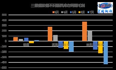 7月份由于原料库存周期不同,成本下降幅度有明显差异,厚壁钢管市场均值震荡下行,7月份品种吨钢毛利相比上月表现分化。以三级螺纹钢为例,以即期原料成本测算7月份毛利空间较上月上升49元/吨,由亏转盈;而以两周、四周原料库存周期测算7月份毛利空间均在亏损区间继续下行,两周原料库存周期测算亏损幅度较上月扩大53元/吨,以四周原料库存周期测算7月份亏损空间较上月扩大206元/吨(详见图2)。