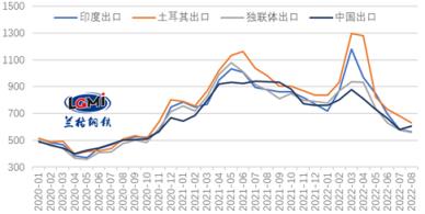 7月份,出口市场竞争激烈,主要出口国继续下调厚壁钢管出口报价。进入8月份,海外需求持续疲弱,各国厚壁钢管出口报价仍有所下调,而国内市场出现反弹,出口报价有所上涨,云商平台监测数据显示,2022年8月5日,印度、土耳其、独联体热轧卷板出口报价(FOB)分别为565美元/吨、630美元/吨和560美元/吨,均较7月底有所下跌,中国热轧卷板出口报价(FOB)为605美元/吨,较7月底有所上涨。