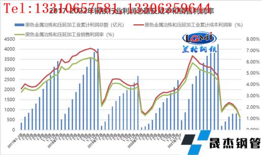 图3 2017-2022年厚壁无缝钢管行业利润总额及成本和销售利润率
