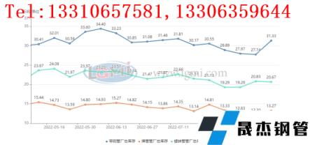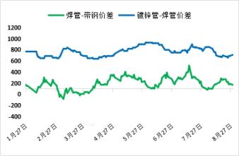 8月焊镀管与原料价差收缩173元(详见图2)。焊管生产利润一度亏损百元左右,继续出现停购原料2-3天的情况;镀锌管生产利润相对抗跌,整体处于亏损边缘。结算周期内焊管生产利润核算平均盈利12元,镀锌管生产利润核算平均盈利57元。
