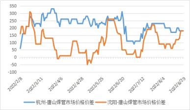 图3 2022年杭州-唐山、沈阳-唐山焊管价差走势图