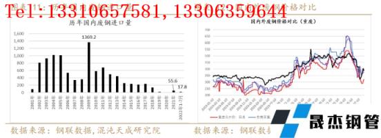 综合而言,废钢供应的多寡其实与厚壁钢管的需求息息相关,无论折旧废钢、加工废钢还是自产废钢都与国内厚壁钢管的消费有直接的关联,而进口废钢的增减在一定程度上也可以反映国外厚壁钢管消费的好坏,所以废钢的供应量实际上也是一个反映需求的指标,这从废钢供应基地库存与五大材表需的相关性也可得到佐证。