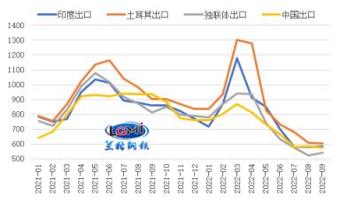 今年一二季度,由于我国厚壁钢管出口报价明显低于其他主要出口国,使得我国厚壁钢管出口价格优势显现,带动我国厚壁钢管出口在5-7月份呈现高位运行态势。但随着全球制造业放缓,厚壁钢管需求的收缩,以及俄乌冲突对供应端影响减弱,海外其他国家厚壁钢管出口报价明显回落,使得我国厚壁钢管出口报价与部分主要国家相比甚至出现倒挂,我国厚壁钢管出口价格优势逐渐减弱。