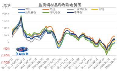 以四周原料库存测算各品种的毛利表现来看,随着前期成本的逐步下移,各品种毛利均呈现震荡回升状态。研究中心监测数据显示,8月底,除热轧卷板及冷轧卷板仍有部分亏损外,其他各品种已重返盈利区间。从月度整体来看,监测的七大品种盈利均有所改善,改善幅度在431-566元/吨之间。其中,三级螺纹钢的月均盈利改善幅度最大,为566元/吨;中厚板的月均改善幅度最小,为431元/吨;其他品种改善幅度在488-546元/吨之间(详见图3)。